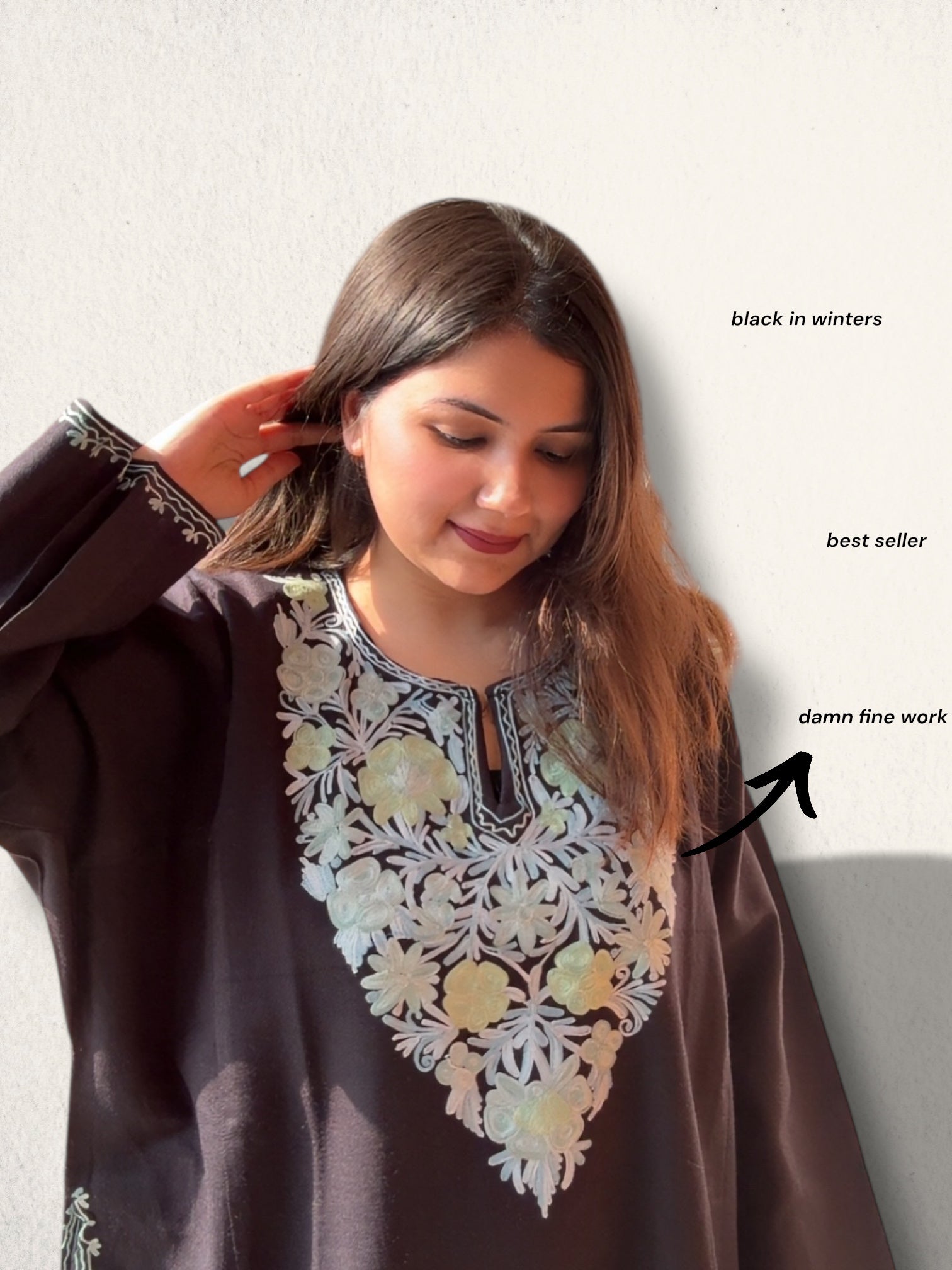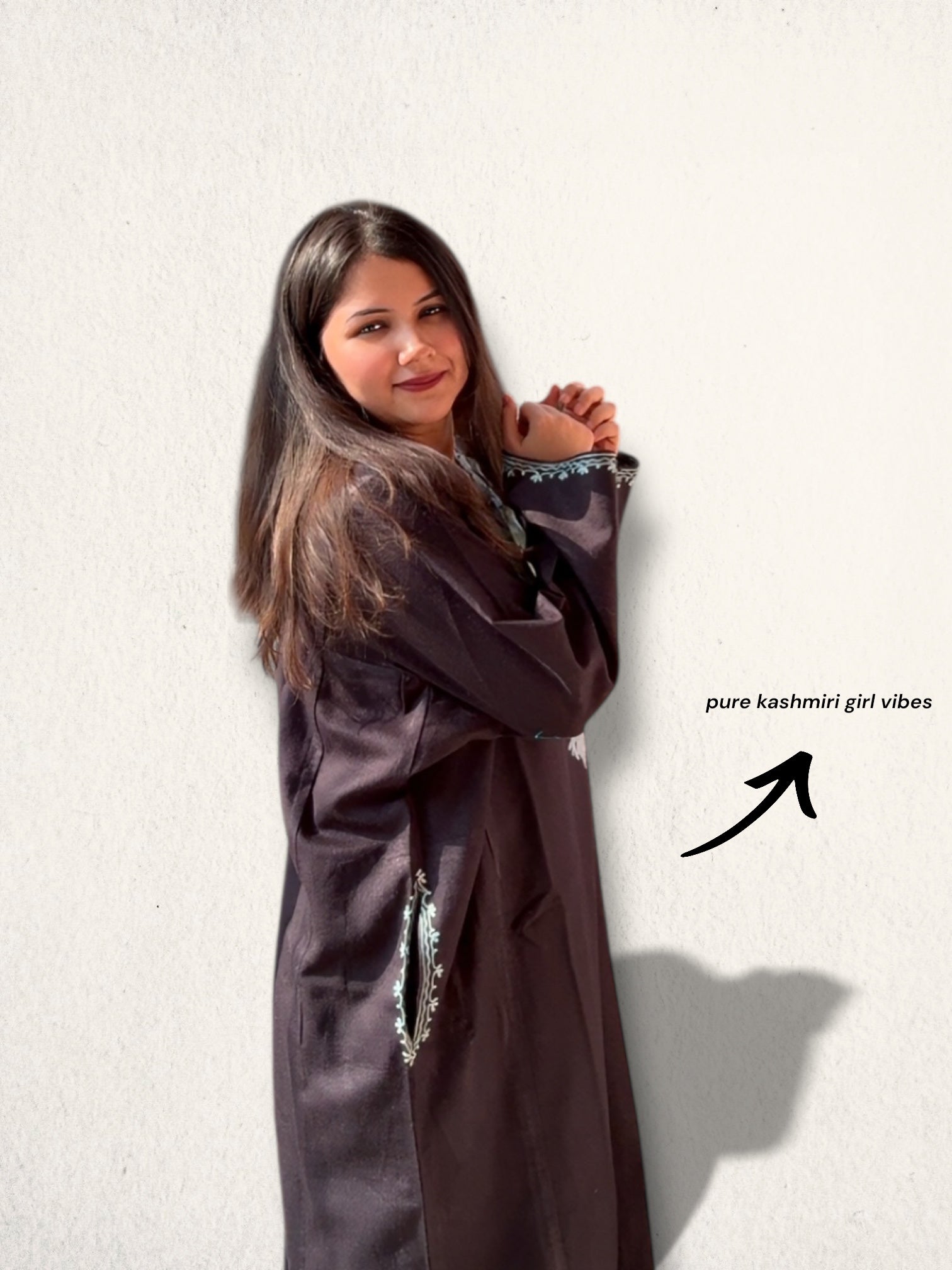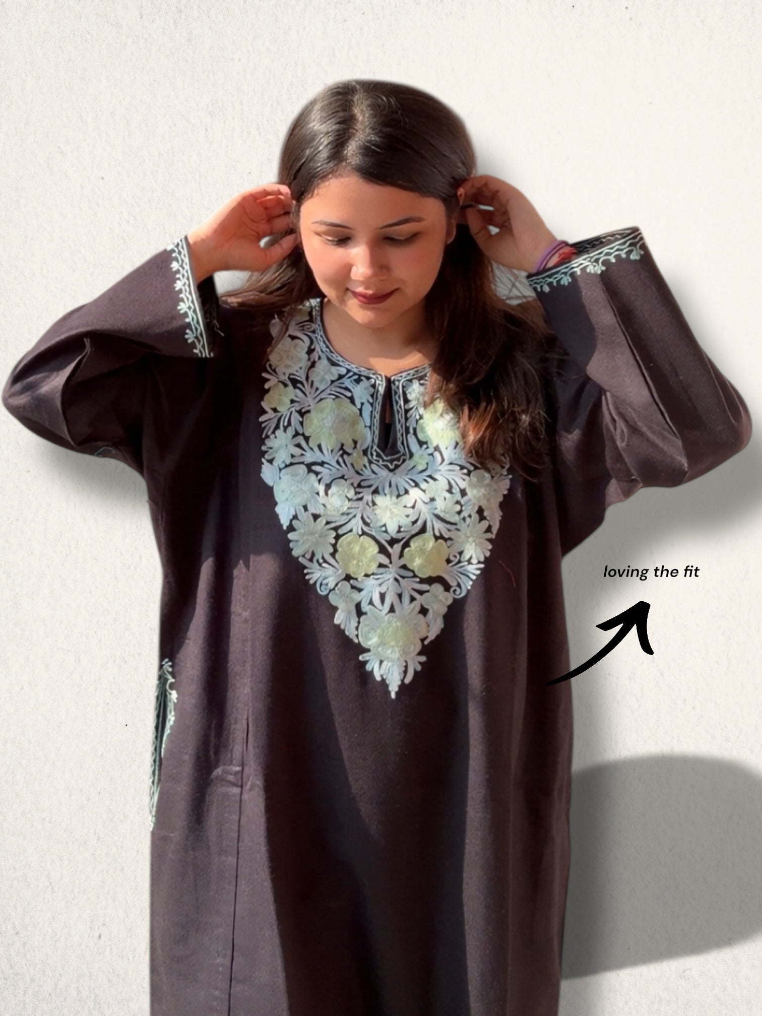 - Crafted from premium wool, this traditional Phiran delivers exceptional warmth through its substantial fabric weight and insulating properties.